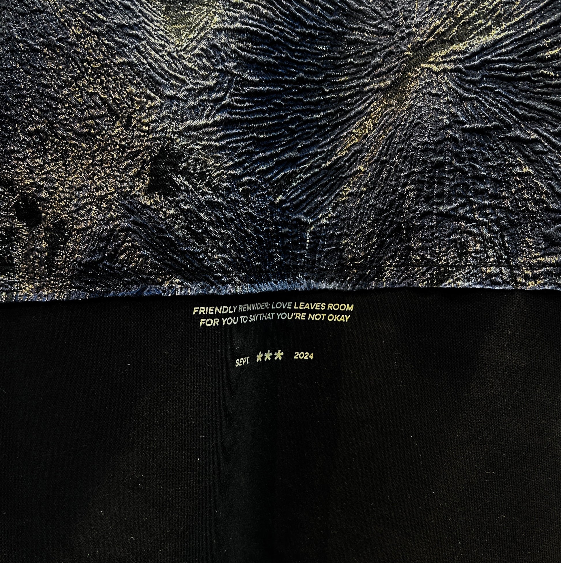 Camiseta Oversized Negra elaborada en tela 100% algodón de 320gr, cuello redondo en rib y monograma en serigrafía de alto relieve en punto corazón en frente y Parche Exclusivo de Jacquard Relieve Fino en la parte posterior.