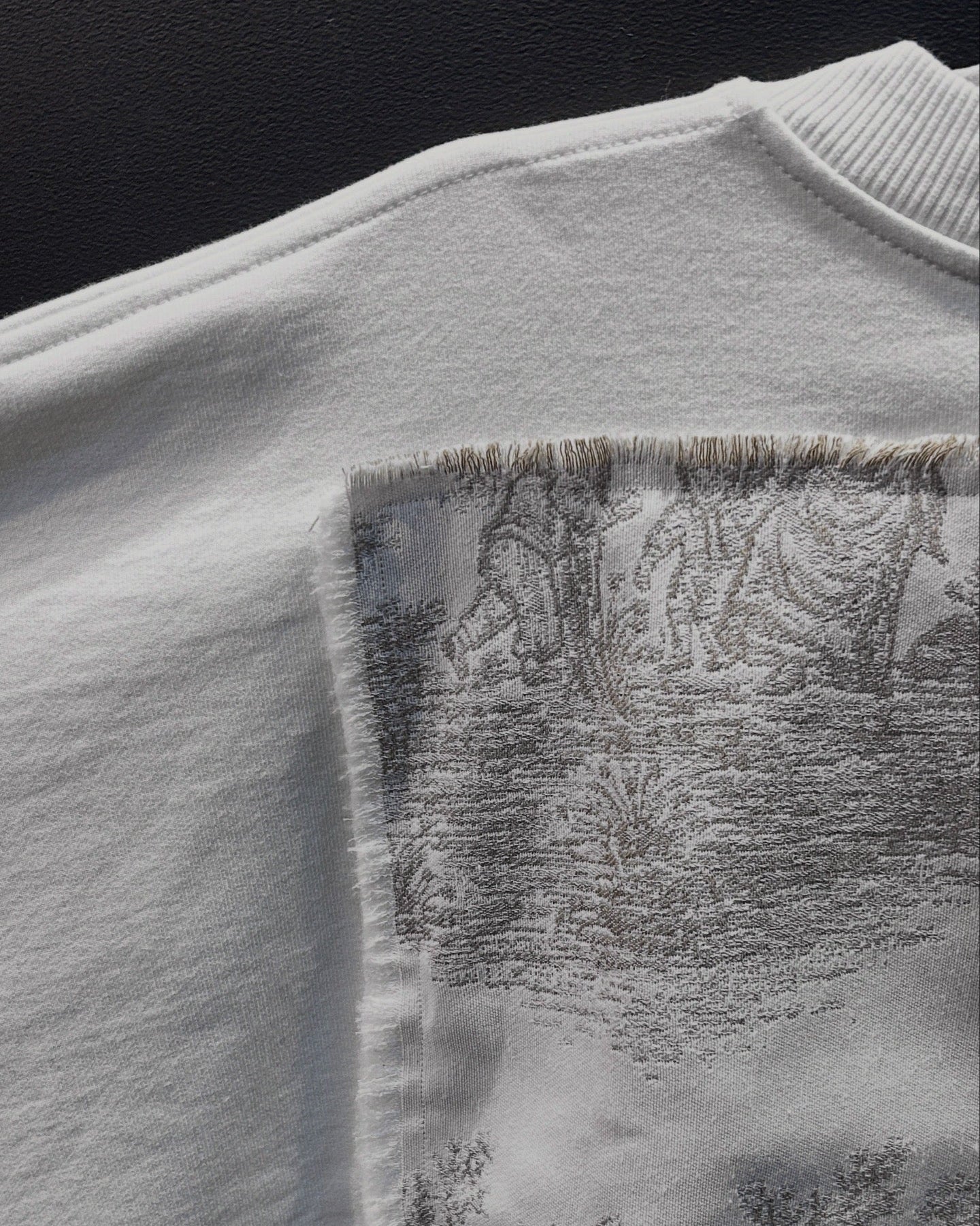 Crewneck boxy fit elaborado en tela 100% algodón de alto gramaje (400gr), cuello, puños y cintura en rib, y aplique de jacquard centrado en la parte posterior con diseño de "niños"