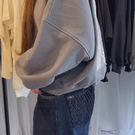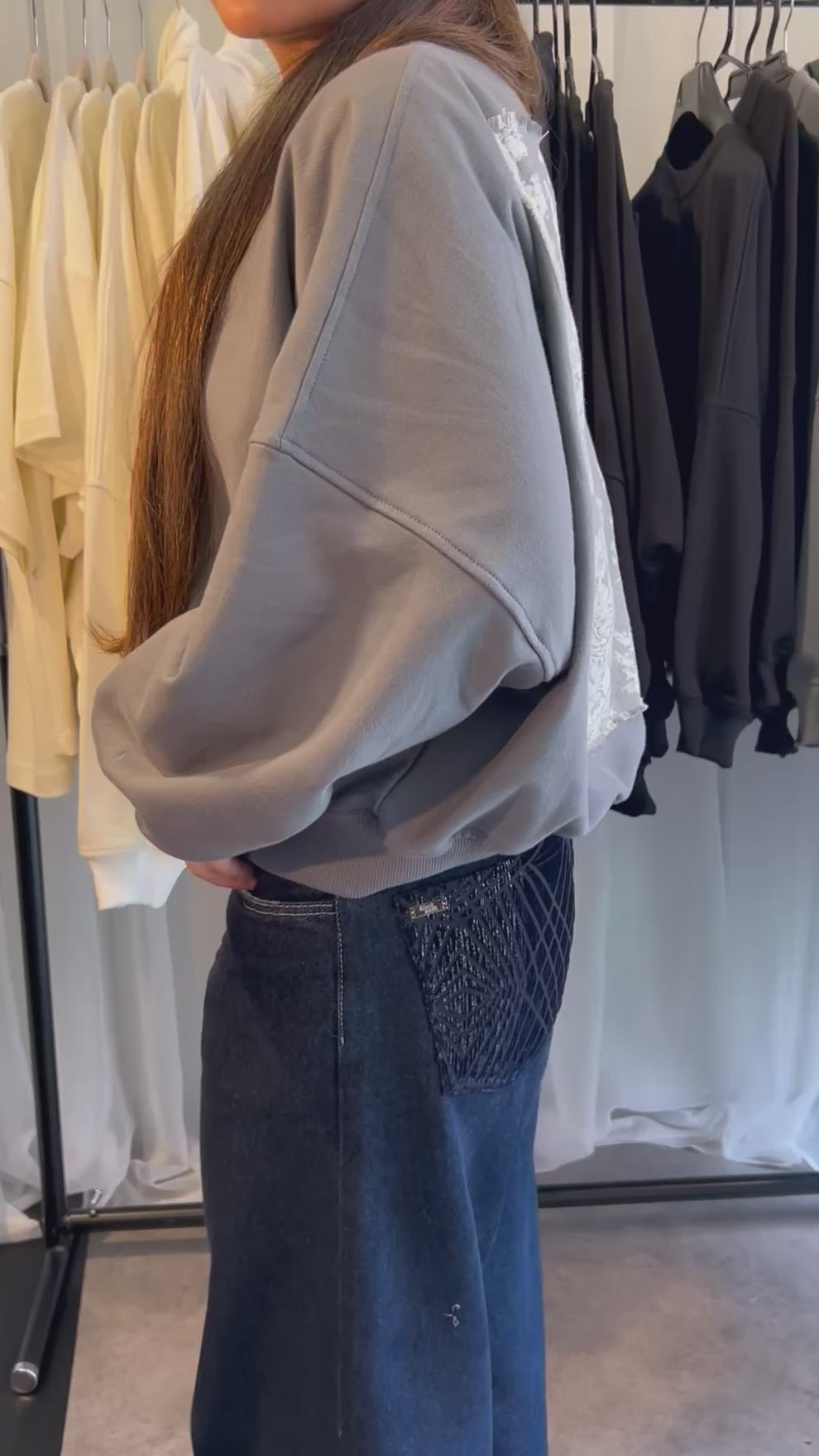 Crewneck boxy fit elaborado en tela 100% algodón de alto gramaje (400gr), cuello, puños y cintura en rib, y aplique de jacquard centrado en la parte posterior con diseño de "niños"