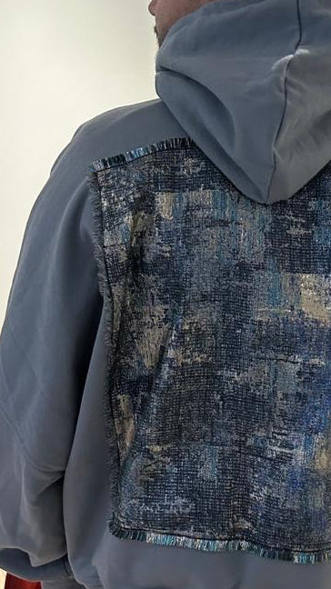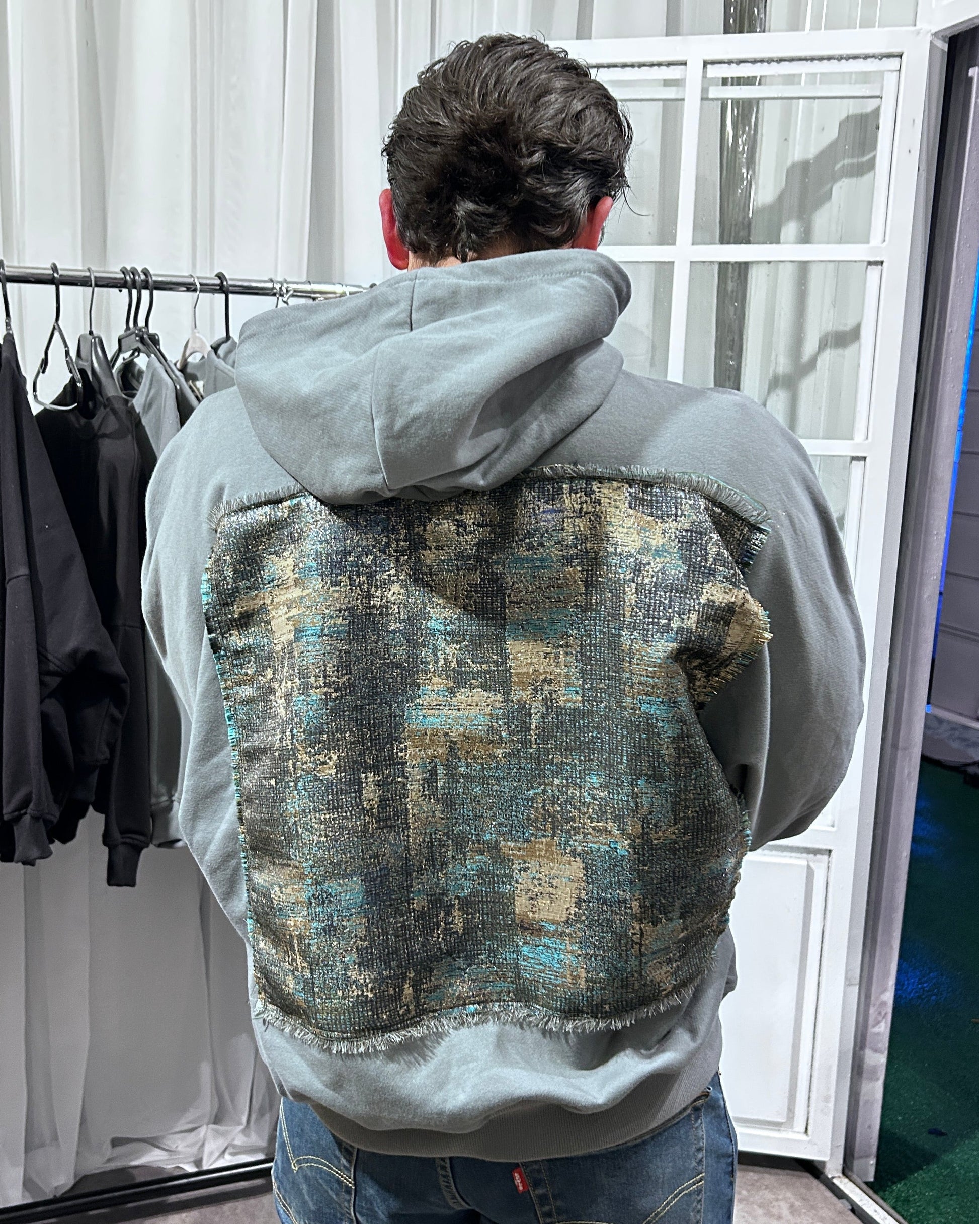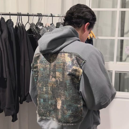 Hoodie boxy fit elaborado en tela 100% algodón de alto gramaje (400gr), puños y cintura en rib, monograma en serigrafía de alto relieve en punto corazón en frente y aplique de jacquard de Relieve Fino centrado en la parte posterior.