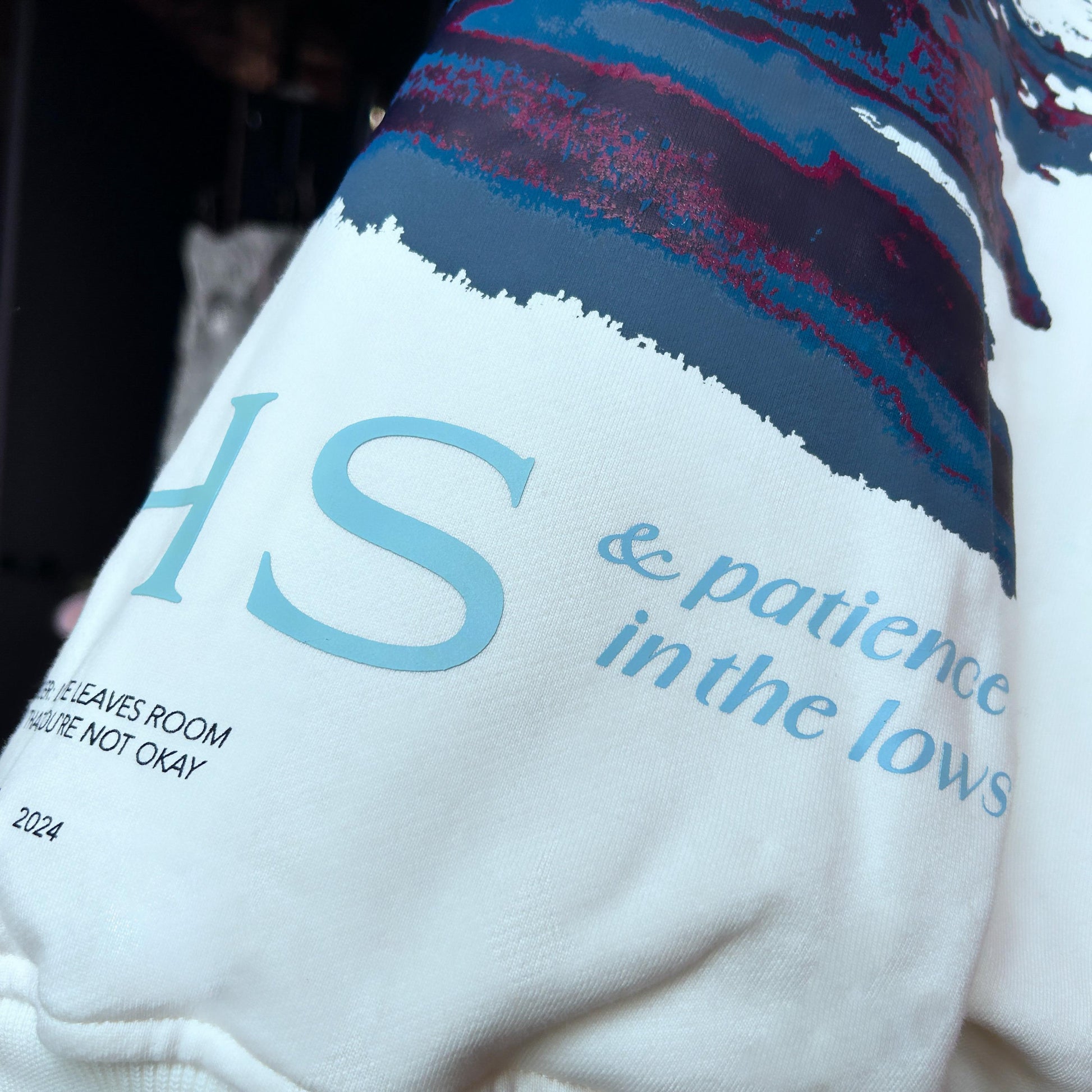 Hoodie boxy fit elaborado en tela 100% algodón de alto gramaje (400gr), puños y cintura en rib, monograma en serigrafía de alto relieve en punto corazón en frente y diseño de la marca “Grateful in the highs & patience in the lows” centrado en la parte posterior.
